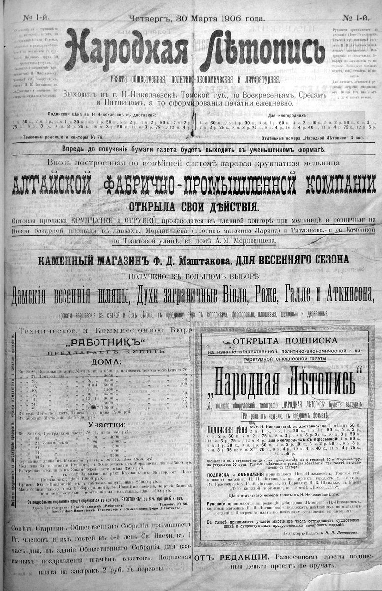 – 120 лет назад вышел первый номер городской газеты «Народная летопись», редактором которой был М. Ф. Курский, издателем – Н. П. Литвинов. К этому времени население города достигло почти 35 тыс. человек. Появилась необходимость освещать событий, происходящих в стране и регионе. Газета выходила на четырёх страницах сначала еженедельно, а затем – три раза в неделю: в среду, пятницу и воскресенье. Кроме Новониколаевска, подписку на «Народную летопись» открыли в Красноярске, Томске и Бийске. В газете было пять постоянных рубрик: «Телеграммы», «Новости Сибири», «Городская хроника», «Русские известия», «Реклама и анонсы». Первая и последняя газетные страницы были заполнены рекламными объявлениями. Просуществовало издание недолго, 14 июля 1906 г. было закрыто, «как угрожающее государственному порядку, общественному спокойствию». #Новосибирск_история Наш сайт Подписывайтесь на нас