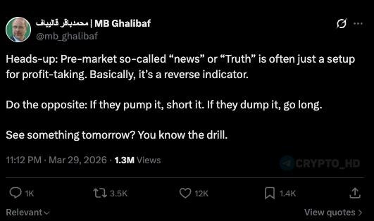 : Так называемые «news» или «Truth», которые появляются на премаркете, часто представляют собой всего лишь подготовку к фиксации прибыли. По сути, это обратный индикатор. Делайте наоборот: если они пампят – открывайте шорт. Если они дампят – открывайте лонг. Увидите что-то завтра? Вы уже знаете, как действовать. P.S. «Truth» в публикации - скорее всего, имеются в виду публикации Дональда Трампа с «хорошими» или «плохими» новостями, которые влияют на финансовые рынки. Мохаммад-Бакир Галибаф (род. 23 августа 1961 года) — иранский политик, консерватор и бывший военный, с 28 мая 2020 года занимающий пост спикера парламента Исламской Республики Иран (Меджлиса). Выходец из Корпуса стражей исламской революции (КСИР), он командовал ВВС КСИР в 1997–2000 годах, ранее возглавлял полицию страны и на протяжении 12 лет (2005–2017) был мэром Тегерана. Галибаф четыре раза баллотировался в президенты Ирана, но успеха не добился; при этом он считается прагматичным менеджером с тесными связями с Вер