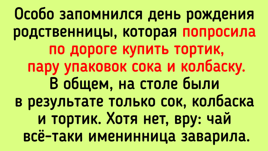 Сама бы не поверила, но пару раз нарывались на подобное. Особо запомнился день рождения родственницы, которая попросила по дороге купить тортик, пару упаковок сока и колбаску. В общем, на столе были в результате только сок, колбаска и тортик. Хотя нет, вру: чай всё-таки именинница заварила. © Дачные дни / Dzen