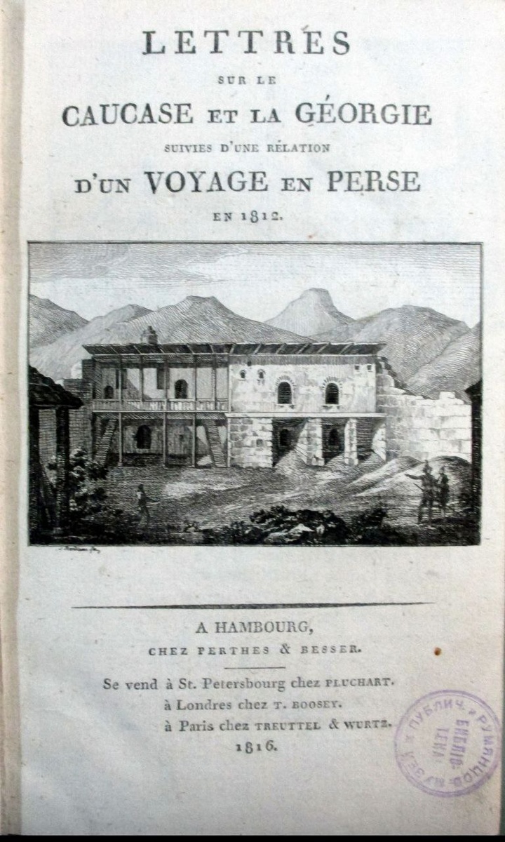 Наша сегодняшняя дорога петляла во все стороны через леса и поля, сквозь горы и долины. Мы видели волшебные пейзажи; Грузия показалась мне красивой страной, чьи жители предпочитают праздность труду и нищету зажиточной, но активной жизни. Этот старинный замок, такой огромный и безлюдный, в нем есть что-то такое, что описывают в романах; судьба старого Ираклия погружает меня в грустные размышления. Ранее здесь сидел знаменитый и влиятельный князь. Сейчас же воздух , проникающий в его гробницу, смешивает прах с могильной пылью. Здесь заседал раньше трибунал, здесь, где столько страстей судились или были осуждены, правят отныне тишина и покой. Наконец, это величественное здание, резиденция блистательного и многочисленного двора, внушительный памятник былого величия, отныне ничто другое как прибежище для уставшего путешественника, похожее на валун, что долго нависает над головой странников, а затем падает и становится алтарным камнем.