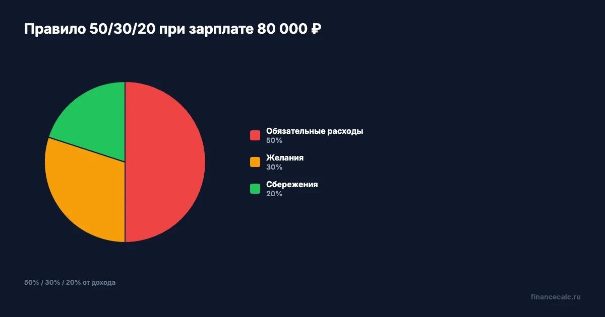 Допустим, ваша зарплата — 80 000 рублей. Тогда рамки бюджета: 40 000 на обязательное, 24 000 на желания, 16 000 на сбережения. Это ориентир, а не закон — отклонение в 5–10% вполне нормально, особенно в первые месяцы.