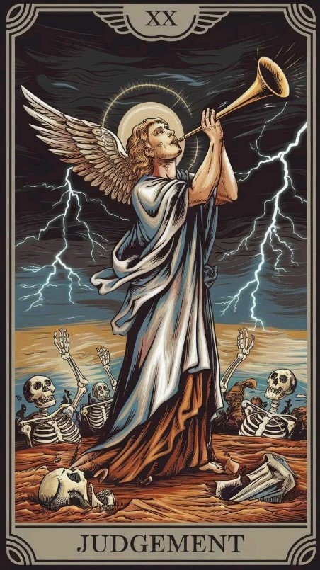 Происходит духовное пробуждение, безмерно возросшая мощь подсознания (традиционно оно ассоциируется с водой, а на карте Уэйта гробы плывут по реке, указывая, что это что-то пробуждается именно во внутреннем мире) увлекает душу в горнило Божественной силы. Суд – это мистерия Преображения, Посвящения, глубинной духовной самореализации, озарения, благовещения, громкий внутренний голос, внятно говорящий какие-то вещи, от которых невозможно увернуться.