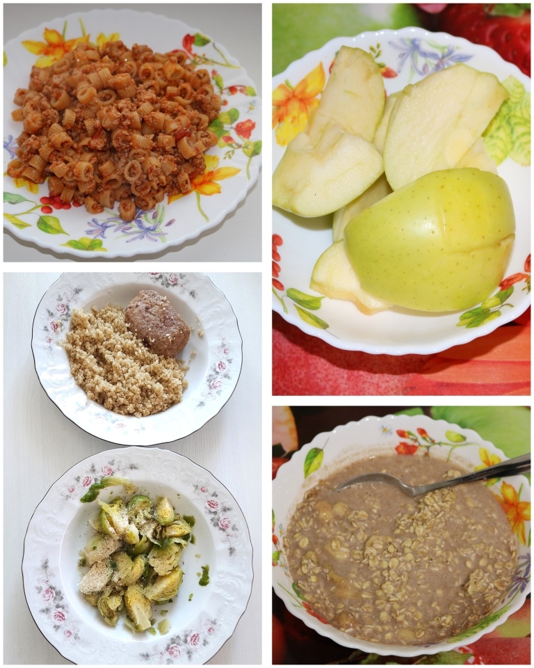 #Завтрак – овсянка в банке с какао. Есть можно в холодном виде, можно чуть погреть в микроволновке. Готовить ее нужно с вечера. В банку засыпаю 50г хлопьев (примерно 4 столовые ложки). 1 банан режу на мелкие дольки. Чайную ложку какао, 1 ч.л. меда. Заливаю молоком, чтобы покрыло овсянку. Закрываю банку. Энергично трясу, чтобы все перемешалось. И все, ставлю в холодильник до утра. #Обед – паста болоньезе. Фарш (лучше свинина-говядина, в идеале самодельный, но тут уж как получится) тушу на сковородке почти до готовности, солю. Добавляю банку готового соуса на основе томатов, пару минут все вместе прогреваю. Отдельно в кастрюле отвариваю макароны до состояния аль-денте. И по готовности добавляю к макаронам фарш с соусом. В дополнение - что-то из свежих овощей, огурец например. И это блюдо будет выглядеть по-разному, если каждый раз делать с новым типом макарон! #Десерт – яблоко #Ужин – отварное киноа. Делаем котлеты из того же фарша, что и был на обед. Замороженная брюссельская капуста.