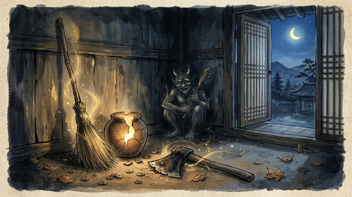 Токкэби (도깨비) — это духи, которые рождаются из старых, выброшенных вещей. Представьте себе: метла, которой пользовались годами, разбитый горшок, старый деревянный топор, вытертая обувь — если эти предметы долго были рядом с человеком, в них может поселиться дух. И тогда вещь превращается в токкэби.