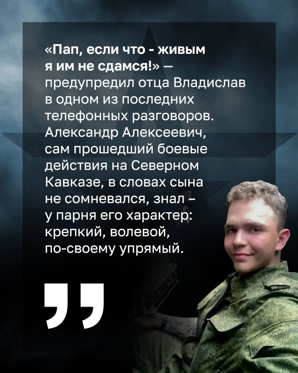«Пап, если что – живым я им не сдамся!» — предупредил отца Владислав в одном из последних телефонных разговоров с родными. Александр Алексеевич, сам прошедший боевые действия на Северном Кавказе, в словах сына не сомневался, знал – у парня его характер: крепкий, волевой, по-своему упрямый. Контракт Владислав подписал ещё во время службы по призыву, причём на срочную отправился по своей воле, будучи студентом второго курса одного из крымских вузов. Был матросом-контрактником на сторожевом корабле Черноморского флота, а когда началась СВО – подал командиру рапорт с просьбой направить его на передовую. ▪️810-я бригада морской пехоты, куда он был распределён, сражалась на самых «горячих» направлениях спецоперации. В задачу группы, в которой действовал матрос Дорохин, входила разведка. Вот и в тот июньский день 2022 года они обследовали лесополосу в Волновахском районе ДНР, когда неожиданно наткнулись на подразделение противника, значительно превосходившее их по численности. Завязался бо