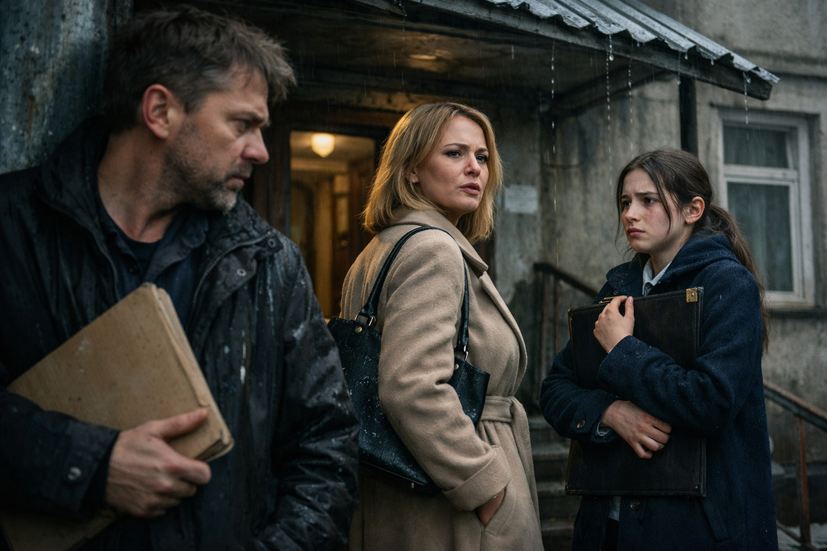 С лестницы подъезда раздался сухой стук. Денис поднял глаза. На площадке между первым и вторым этажом, у самого узкого окна, стояла Катя. В тёмно-синем школьном пальто, с папкой для рисунков на груди. Она не двигалась. Только смотрела вниз — не на мать, а чуть мимо неё, будто ещё не решила, делать вид, что ничего не слышала, или повернуться и уйти обратно.