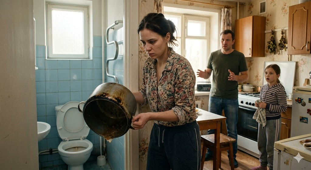 Маша зашла в туалет. Она подняла крышку унитаза и медленным, размеренным движением начала выливать туда борщ. Красная, густая жидкость с кусками мяса и овощей с шумом устремилась вниз. Запах чеснока и наваристого бульона заполнил маленькое помещение.