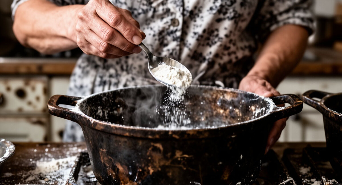 Нагар на дне. Желтый налет на стенках. Следы от пригоревшей каши, которые не оттираются даже металлической губкой. Кастрюля, которая верой и правдой служила годы, выглядит так, будто ее пора отправлять на дачу — мыть картошку. Выкинуть жалко, пользоваться неприятно. Знакомая картина? Большинство начинает скрести, тереть, замачивать на сутки. А есть способ, который требует только воды, огня и трех ложек из кухонного шкафа. Никакого скребка. Никаких дорогих средств. Через 20 минут кастрюля сверкает, как в день покупки.