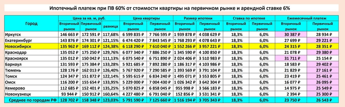 🟰 Ежемесячный ипотечный платеж на первичном и вторичном рынках Новосибирска выравниваются при первоначальном взносе 55-60