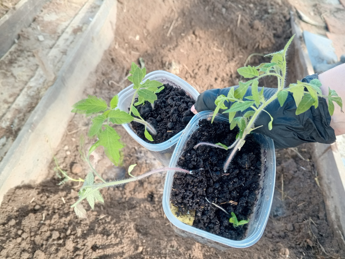 В этом году ранняя весна радует нас своими тёплыми и солнечными днями. ☀️ А у меня так и чешутся руки поскорее что-нибудь посадить! 21 марта 2026 года Ради эксперимента я решила попробовать высадить томаты 🍅 в теплице. Надеюсь уже в июне попробовать первые свои первые помидорки. Прочитала об этом методе в интернете и подумала, почему бы не попробовать. Было у меня 6 томатов. Названия сортов точно не знаю, нашла семена у мамы в закромах. Им уже лет 7, наверно. Я посеяла их ещё в январе, чтобы посмотреть, взойдут или нет. А они и взошли. Не все, конечно, но взошли. ☺️ Вот они, в маленьких баночках, без пикировки. Дата посева - конец января. Ну, а теперь о самом способе посадки... В середине теплицы выкапывается яма, сантиметров 40 глубиной. Размеры примерные: 1 м ширина, 1 м высота и 40 см глубина. Вот эта ямка: На низ уложила навоз, остатки прошлогодней травы, присыпала всё это землёй. Затем, как обычно, сделала лунки, добавила золы, и пролила горячей водой. А теперь дело техники. Бер