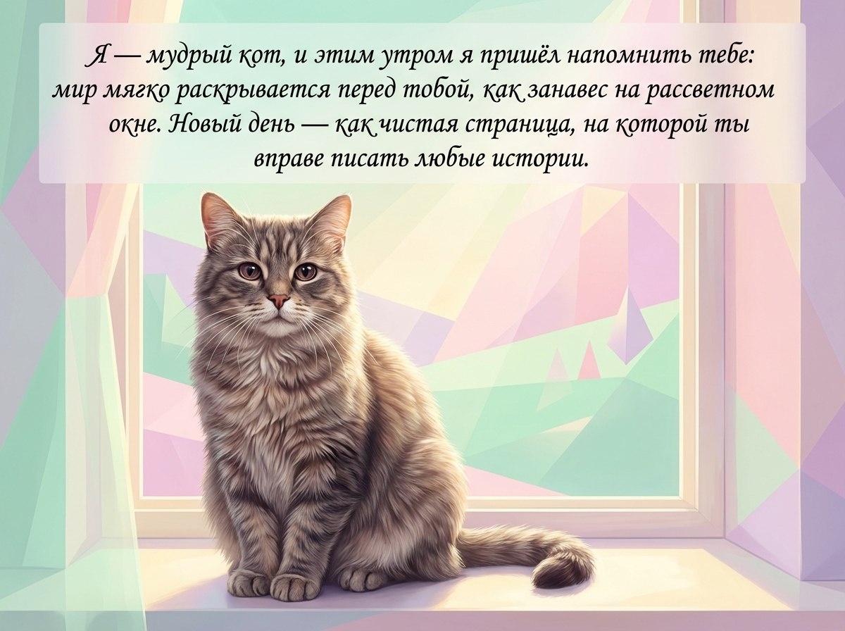Я — мудрый кот, и этим утром я пришёл напомнить тебе: мир мягко раскрывается перед тобой, как занавес на рассветном окне