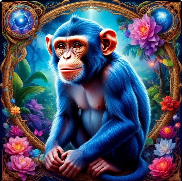 «Я — Синяя Резонансная Обезьяна. Я настраиваюсь на волну магии и радости. Я — чистый канал для космического юмора и игры. Через меня течёт исцеляющий смех, преображающий реальность».