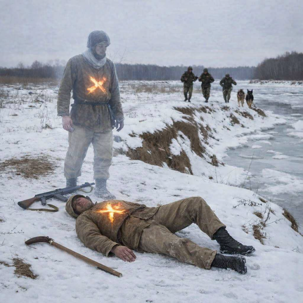 Точнее, мое сознание отделилось от того, что я столько лет считал собой, своим телом. Физически почувствовал, как выбираюсь из умирающего тела. Тем временем мои преследователи приближались. Я понял, что умер; у меня было какое-то бесшабашное настроение, какое бывает, когда сбросишь с плеч огромную ответственность. Я взял из своих собственных окровавленных, переломанных пальцев автомат и, дав очередью крест-накрест по своему телу, бросил автомат рядом на снег.
