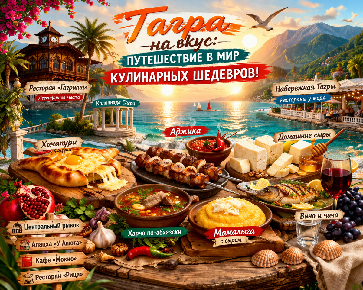 Гагра — это не просто курорт с морем и пальмами. Это место, где путешествие превращается во вкусное приключение. Здесь каждая улица пахнет свежим хлебом, специями и морским бризом, а местная кухня — это смесь традиций, гостеприимства и настоящего южного характера.