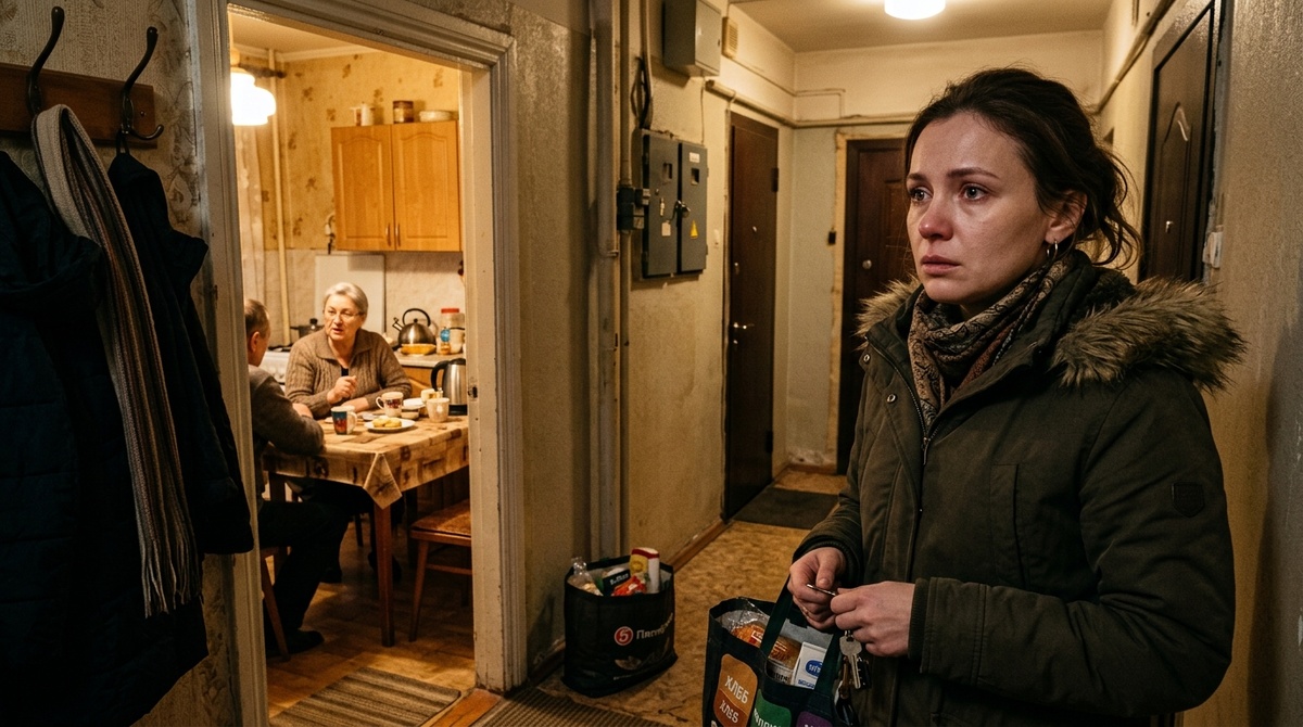 Надя стояла тихо. В правой руке держала пакет с продуктами — картошка, лук, кефир, батон. Левой рукой она только что сняла сапог, не успела снять второй. Голос свекрови доносился из кухни, чёткий, уверенный, как будто произносился не шёпотом, а вслух, для всех.