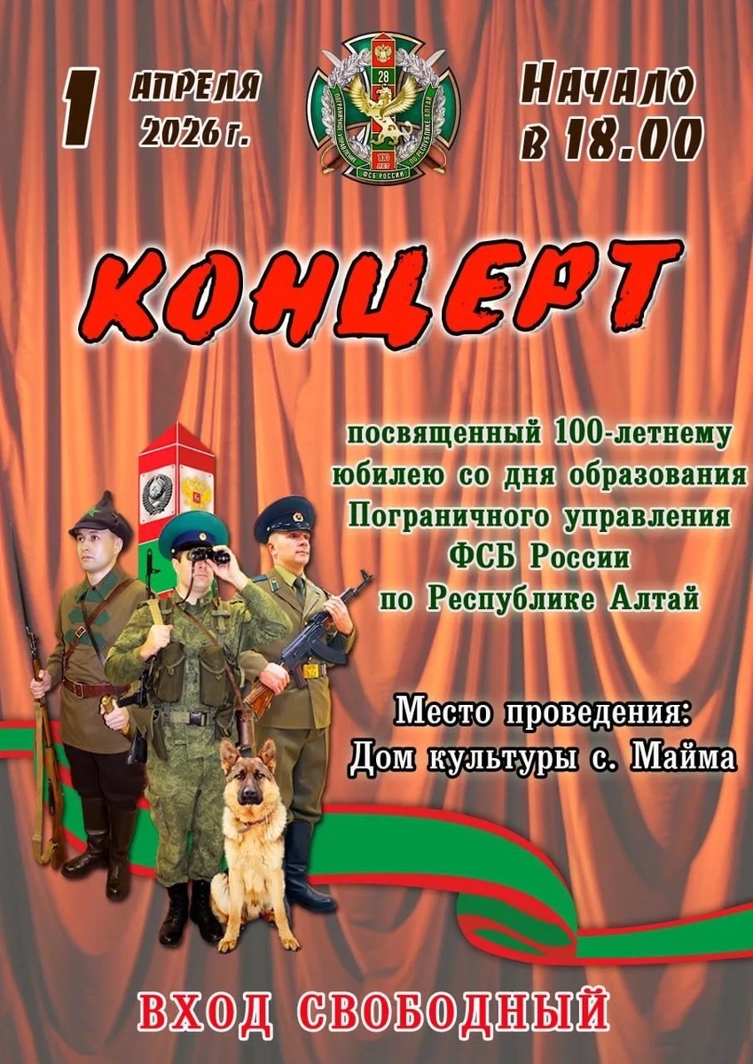 В Доме культуры села Майма состоится концерт, посвящённый вековому юбилею Пограничного управления ФСБ России по Республике Алтай. Приглашаем всех желающих разделить этот важный праздник. Вход свободный. 📍 Где: ДК с. Майма 🕕 Когда: 1 апреля 2026 года, начало в 18:00