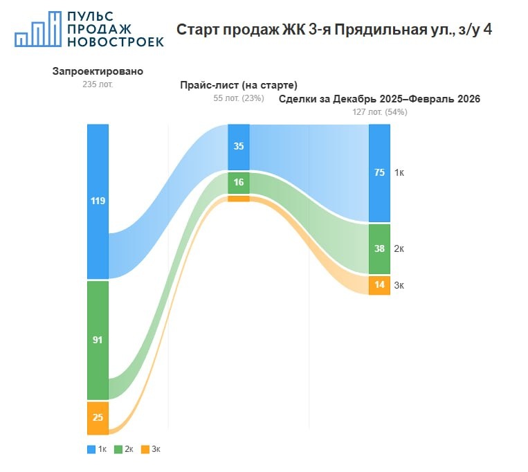 Проект комфорт-класса от «Фонда реновации», реализуется под брендом Москварталы в Измайлово. До метро Измайловская около 15 минут пешком. Продажи стартовали в декабре 2025. За 2 месяца прошло 127 сделок при общем объёме 235 квартир. Продано 54% квартир. Ввод заявлен в III кв. 2027, ключи до 31.03.2028. 🚇📊 На старте в продажу вывели 23% квартир, основа — однокомнатные. Все квартиры с отделкой. Вход был с 1к 28 м² за ~9.6 млн ₽. Основной сегмент однокомнатных — ~10.5–13 млн ₽ за 30–40 м². Двухкомнатные — ~15.9–17.5 млн ₽ за 55–60 м². 🧱 Сейчас в продаже квартир нет. Проект на сайте отмечен как «скоро в продаже», но оставшийся объём вероятно пойдёт под переселение по реновации. Спрос сосредоточен в однокомнатных квартирах, 59% сделок. Двухкомнатные заняли около трети спроса. Трёхкомнатные покупали точечно. В структуре проекта преобладают однокомнатные квартиры. Второй по доле сегмент — двухкомнатные квартиры. Трёхкомнатные представлены ограниченно. Локация с высокой конкуренцией,