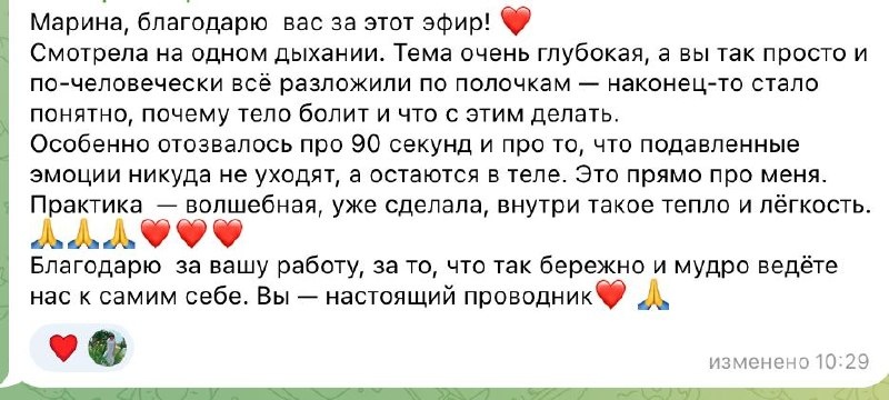 Оно говорит, но мы не слышим Мои хорошие, я до сих пор получаю ваши отклики после пятничного эфира. И каждый раз, когда читаю их, внутри разливается тёплое, спокойное чувство. Злата написала: «По всему позвоночнику такое тепло пошло, ощущение умиротворения и спокойствия. Тело как будто в тепловом коконе. Благодарю от души». Виктория поделилась: «Наконец-то стало понятно, почему тело болит и что с этим делать. Практика волшебная — внутри тепло и лёгкость. Спасибо за то, что так бережно ведёте нас к самим себе». Олеся написала: «После эфира полное умиротворение. Хочется разобраться глубже». Знаете, что на самом деле произошло в тот вечер? Когда вы услышали про проглоченные обиды, про то, что тело хранит всё непрожитое — что-то внутри узнало себя. Тело выдохнуло: «Наконец-то кто-то назвал это вслух». Тепло, лёгкость, умиротворение — это не просто приятное послевкусие. Это первое движение. Но это только начало. Потому что есть вопрос глубже: почему у одних после одной практики с