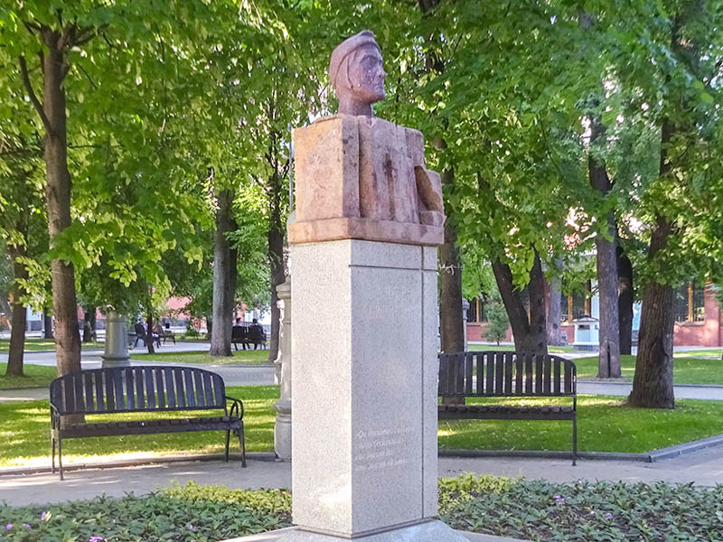 часть 2 - https://dzen.ru/a/aaap6FMz9TN2Pdcv бюст итальянскому поэту, мыслителю Данте Алигьери (скульпторы Ринальдо Пирас и Алексей Тихонов), сад Эрмитаж, ул.Каретный Ряд,3 бюст писателю, фольклористу и журналисту П.П.Бажову (скульптор А.Козырев), улица Бажова, сквер Бажова бюст композитору М.И.Глинке, сад Эрмитаж, улица Каретный Ряд, 3 бюст французскому писателю, политическому и общественному деятелю В.Гюго (скульптор Лоран Маркест), сад Эрмитаж, улица Каретный Ряд, 3 бюст русскому поэту В.А.Жуковскому (скульптор А.Н.Бурганов), Лялин переулок, д. 28/19, в соседнем здании расположена библиотека имени Жуковского бюст писателю А.Н.Островскому (скульптор Г.И. Мотовилов), ул.Малая Ордынка, д.9/12 бюст русскому и индийскому художнику С.Н.Рериху перед усадьбой Лопухиных (скульпторы Ю.Ю.Гавюк и А.Д.Леонов), Малый Знаменский пер., 3/5 бюст востоковеду,