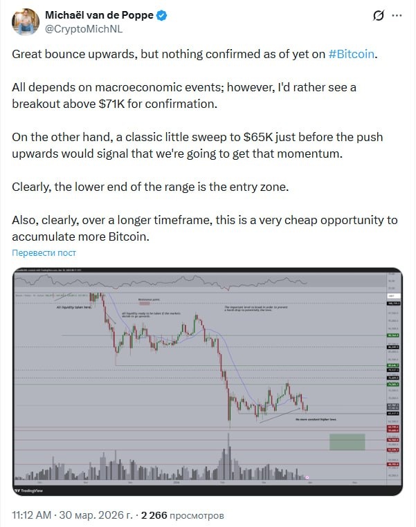 Всё зависит от макроэкономических событий; однако я бы предпочёл увидеть пробой выше $71 000 для подтверждения. С другой стороны, классический небольшой ликвидационный заход на $65 000 непосредственно перед толчком вверх будет сигналом, что мы получим этот импульс. Очевидно, что нижняя граница диапазона — это зона входа. Также очевидно, что на более длительном временном горизонте это очень дешёвая возможность накопить больше биткоина.