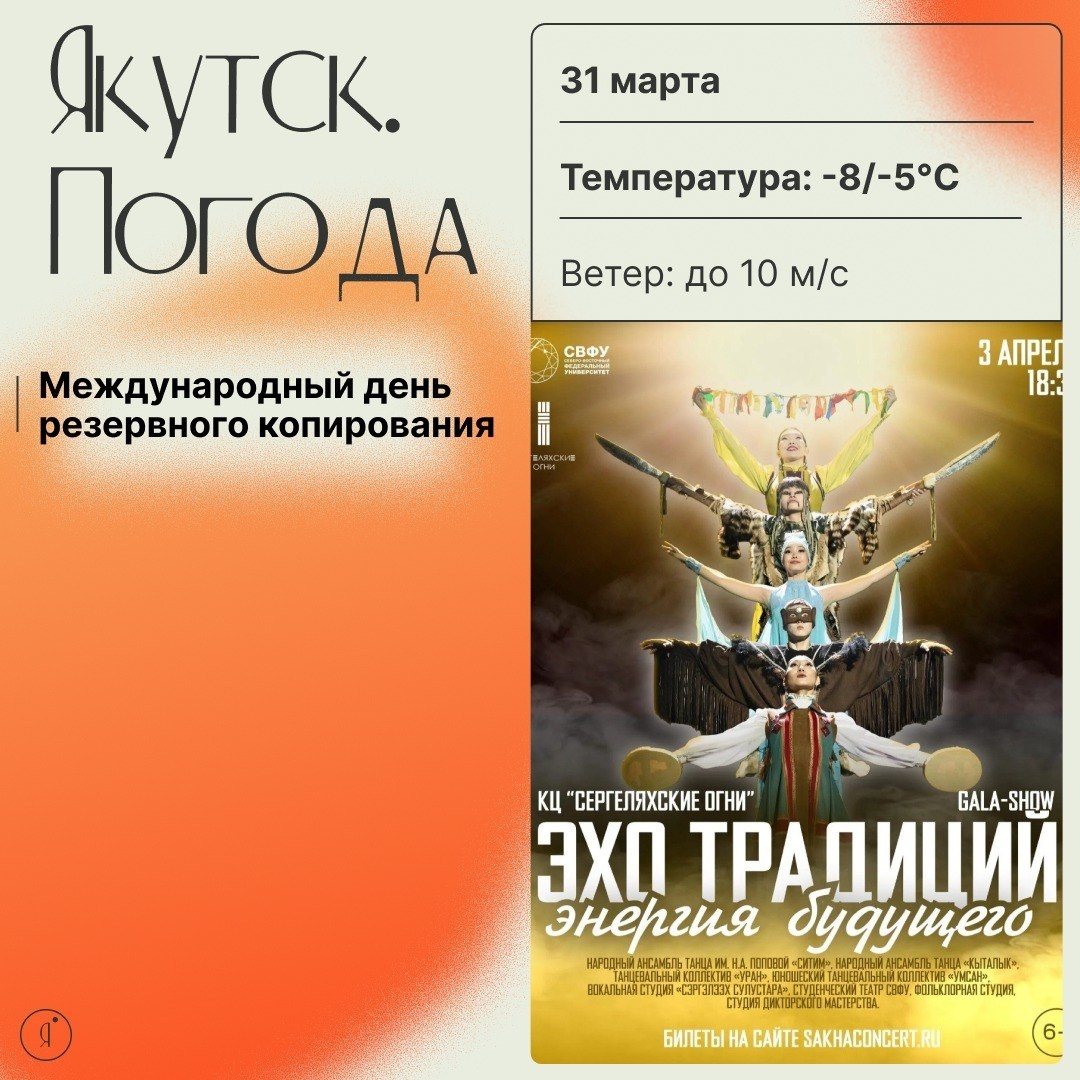 » Зрелищная презентация масштабного проекта «ВОЗРОЖДАЯ ЛЕГЕНДУ», посвященного Году культуры в РС(Я). В проекте заняты: - народный ансамбль танца им. Н.А. Поповой «Ситим» - народный ансамбль танца «Кыталык» - танцевальный коллектив «Уран» - юношеский танцевальный коллектив «Умсан» - вокальная студия «Сэргэлээх сулустара» - Студенческий театр СВФУ - фольклорная студия - студия дикторского мастерства 📍 Культурный центр «Сергеляхские огни» 🕕 3 апреля | 18:30 Online Якутия | Ждем вас в МАХ