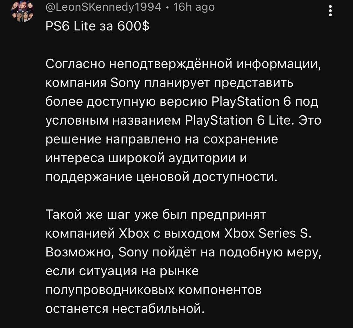 Ну всё, победа, можно расходиться. Правда, если чуть притормозить и копнуть глубже, источник у этой «новости» — обычный срач инсайдеров в X (бывший Twitter). В процессе один из них просто ПРЕДПОЛОЖИЛ, что Sony могла бы выпустить удешевлённую версию консоли следующего поколения с характеристиками примерно уровня PS5. Не «разрабатывает», не «готовит к анонсу», не «утечка документов» — а просто гипотеза в духе «а что если?». И вот из этого рождается: PS6 Lite уже в пути. Красиво, конечно. Люблю современную игровую журналистику — из воздуха делают инфоповоды, а потом сами же их обсуждают. Хотя, если отбросить иронию, сама идея не выглядит совсем уж безумной. Рынок сейчас реально меняется: железо дорожает, разработка дорожает, аудитория растёт, но платить по $900 – $1000 готовы не все. Логика «более доступной версии» на старте поколения — звучит как потенциальный ход. Вон, Microsoft уже играла в это с Series S. Но между «логично в теории» и «Sony делает это прямо сейчас» — пропасть раз