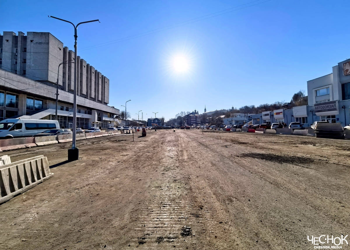 Ее освободили от автомобилей. Там будут перекладывать коммуникации, а затем разобьют клумбы. Пока огороженное бетонными блоками пространство пустует, подрядчик начал рыть траншею. Автомобилистам также стало неудобно. По площади организовали круговое движение, но одна полоса превратилась в парковку, так что при высадке пассажиров у вокзалов возникают заторы.