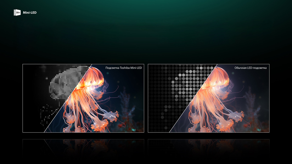 - MiniLED. LED-подсветка с минисветодиодами, которые меньше традиционных приблизительно в 50 раз. За счет небольшого размера можно разместить больше минисветодиодов на той площади, которую занимало предыдущее поколение светодиодов покрупнее. Больше минисветодиодов – больше зон локального затемнения. Больше зон локального затемнения – значительнее яркость, глубже черный, выразительнее контрасты. Плюс ко всему – нет риска выгорания пикселей.