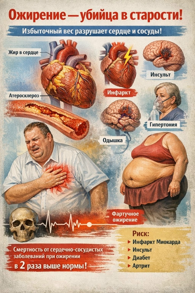 В XX веке исследователи охарактеризовали ожирение как одну из главных причин преждевременной смертности в пожилом возрасте. Прежде всего при этом состоянии страдает сердечно-сосудистая система. Практически каждый человек с избыточной массой тела входит в группу риска по кардиологическим заболеваниям, а сама тучность во многом объясняет повышенную смертность. У таких людей сердце располагается более поперечно из-за приподнятой диафрагмы, при этом его размеры зачастую превышают норму. Жировые отложения формируются как вокруг сердца (между листками перикарда), так и внутри миокарда, что приводит к дистрофическим изменениям и нарушает нормальную работу органа. Смертность от сердечно-сосудистых заболеваний у людей с ожирением примерно вдвое выше, чем у людей с нормальной или сниженной массой тела. Наиболее опасными считаются атеросклеротические поражения сосудов. Их развитие тесно связано с нарушением жирового обмена — повышением уровня холестерина, триглицеридов и других липидов в крови. В