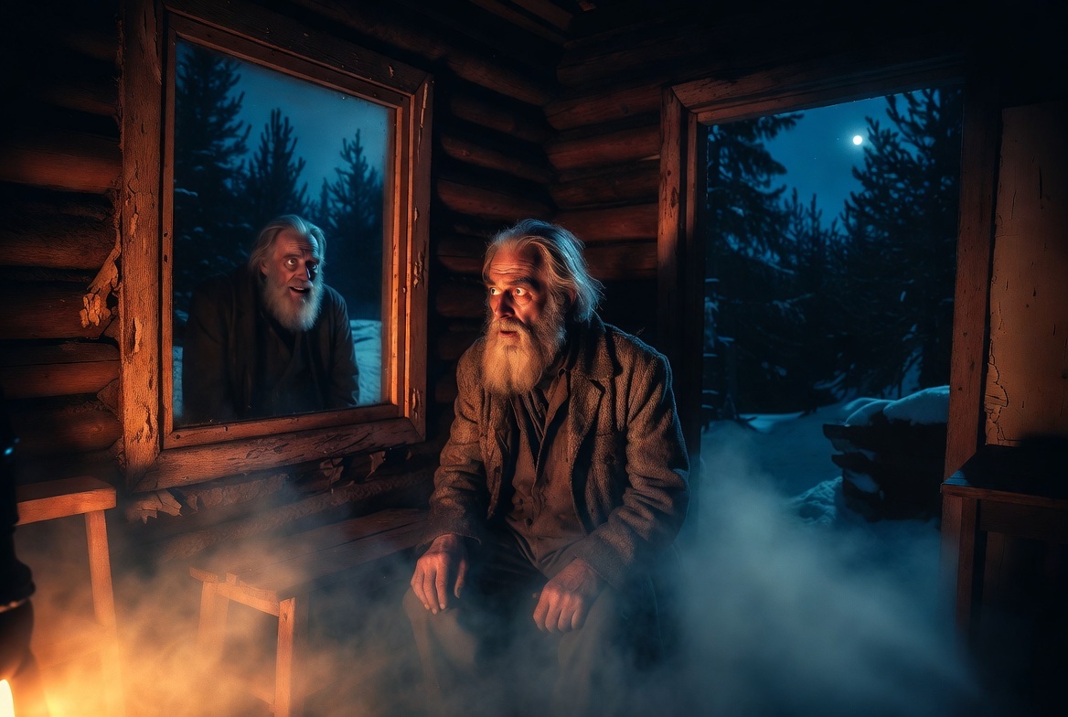 Я поднял глаза и посмотрел в зеркало, что висело напротив. В отражении я сидел у печи, пил чай, смотрел на огонь. Но за моей спиной стоял другой. Такой же старый, в таком же ватнике. И он смотрел на меня. Не на отражение — на меня.
