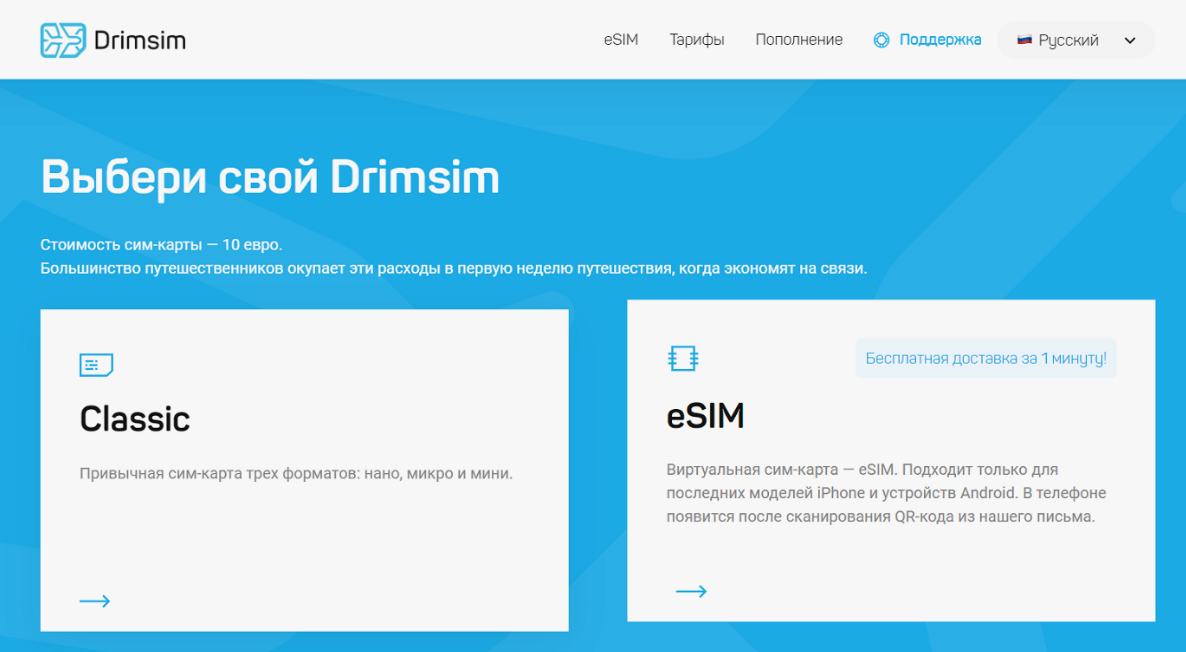 💡 Совет: Если телефон не поддерживает eSIM, DrimSim предлагает физическую SIM-карту с доставкой — это уникальное преимущество сервиса.