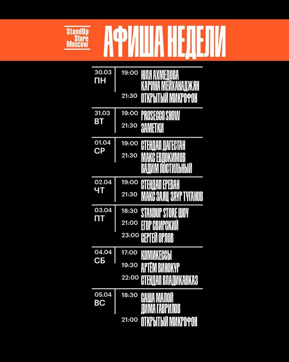 В понедельник, 30 марта В 19:00 совместный концерт Юлии Ахмедовой и Карины Мейханаджян В 21:30 открытый микрофон Во вторник, 31 марта В 19:00 Prosecco show В 21:30 шоу заметки В среду, 1 апреля В 19:00 стендап Дагестан В 21:30 совместный концерт Макса Евдокимова и Вадима Постильного В четверг, 2 апреля В 19:00 стендап Ереван В 21:30 совместный концерт Макса Зайца и Заура Туганова В пятницу, 3 апреля В 18:30 StandUp Store Show В 21:00 сольный концерт Егора Свирского В 23:00 сольный концерт Сергея Орлова В субботу, 4 апреля В 17:00 комикессы В 19:30 сольный концерт Артема Винокура В 22:00 стендап Владикавказ В воскресенье, 5 апреля В 18:30 совместный концерт Саши Малого и Димы Гаврилова В 21:00 открытый микрофон