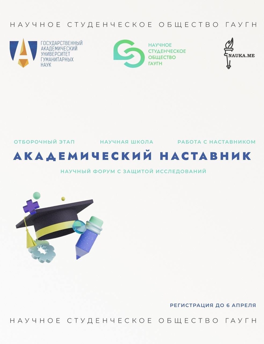 » Научное студенческое общество ГАУГН объявляет о запуске проекта «Академический наставник», направленного на вовлечение студентов в научно-исследовательскую деятельность и развитие академических компетенций. Проект ориентирован на студентов, которые планируют начать или углубить свою работу в науке, получить опыт написания исследовательских работ, установить профессиональные контакты. 📌Программа проекта включает четыре этапа: • регистрация участников — до 6 апреля; • научно-практическая междисциплинарная школа (лекции и мастер-классы от ученых) — до 8 мая; • работа с наставниками по теме исследования — до 28 мая; • научный форум «Россия как цивилизация: научное наследие и глобальные вызовы современности» — 29–30 мая. ✔️ Регистрация на участие доступна по ссылке. ➡️ Подробная информация о проекте #простРАНство_ГАУГН #ГАУГН #СНО_ГАУГН #gaugn_event 👻 МАХ 📲 ВК 📺 RT 📝 ДЗЕН