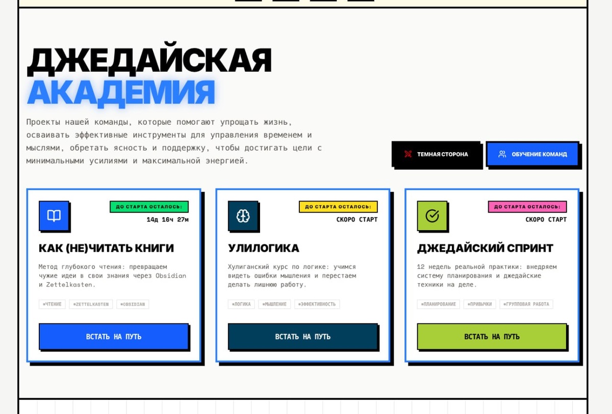 ! У меня на сайте появился раздел корпоративного обучения, который я добавил в общую секцию, связанную с обучением. Так как у нас с Максом общий вайб от Джедаев, ну так сложилось, уже узнаваемый бренд, уже узнаваемые техники. А мы “за глаза” между собой называли наши программы “Джедайская Академия”, я решил на своём сайте в секцию “вкинуть” небольшую игровую механику. Когда вы выбираете обучение “себе”, то она автоматически открывается в “белой” теме, но если нажать “перейти на темную сторону силы”, то тема секции обучения изменяется на тёмную. При этом изменяются некоторые элементы управления. Например, кнопка посмотреть программу у Джедаев имеет название “Встать на путь”, а когда вы перешли на тёмную сторону силы, то кнопка превращается в “Принять вызов”. В общем, небольшие пасхалки и вариация “двойного кодирования”. . Так вот … вчера мне пишет друган и говорит, что он ожидал, что при нажатии “Перейти на темную сторону” он провалится в секцию корпоративного обучения. Нормальная ди
