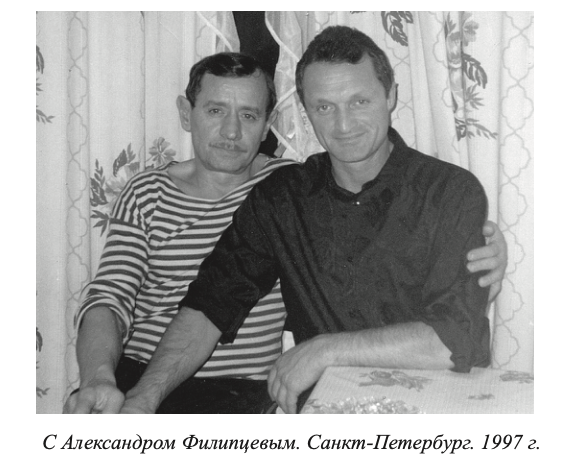 С Александром Филипцевым. Санкт-Петербург. 1997 г. Знаю примеры, когда чужие люди после одной встречи становились как родные. Знаю, когда из-за раздела родительского дома, или когда парень тряпка, идет на поводу у своей недалекой жены, прекращает всякие отношения с братом. Кровное родство нельзя забывать. Наверное, генетическая связь с родными братьями и сестрами сидит в нас. Я похоронил отца, маму, брата, трех старших сестер, у всех был на похоронах, плакал навзрыд. Уходил во двор, отходил от гроба, чтобы успокоиться. Через время подходил к изголовью, но снова не мог себя сдержать, плакал. Ум, сердце, душа – вся моя сущность накалялась до предела. Я таял от чувств. Мне было жалко всех. Не знаю, как правильно себя вести на похоронах, но я плакал, как ребенок. Есть ребята, холодные, как лед. Брат или сестренка рядом, мама с отцом еще живы, а он находит дела поважней, чем встречи с близкими родными. Разные мы по достатку, росту, весу, уму и красоте, но мы одинаково должны любить и заботиться о родителях, не забывать о своих сестрах и братьях.