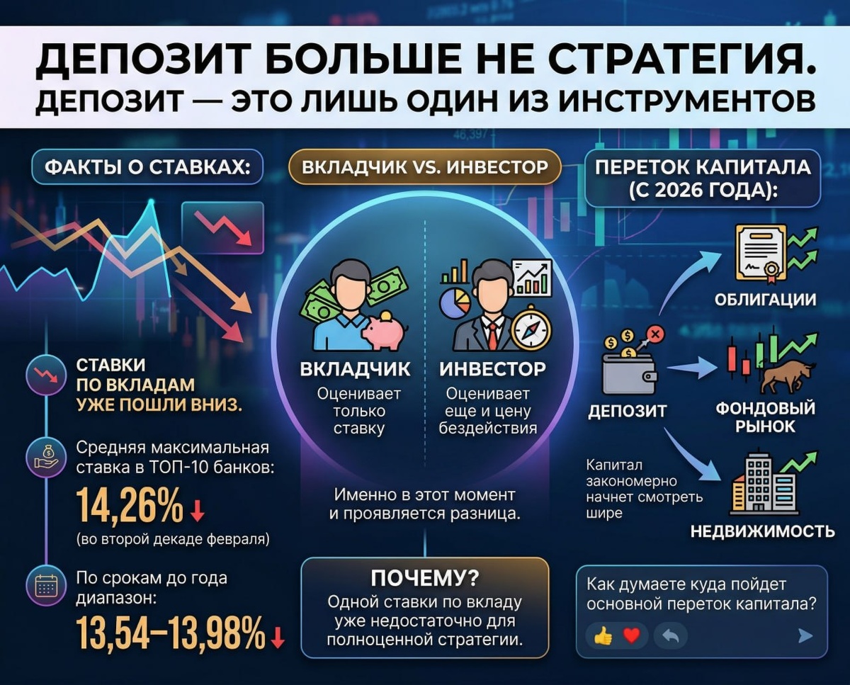 ΠΎΠ΄ΠΈΡΡΡ ΠΏΡΠΈΠΌΠ΅ΡΠ½ΠΎ Π² ΡΠ°Π·ΠΌΠ΅ΡΠ΅ 13,54β13,98%. π§ΠΠ»Ρ ΡΠ°ΡΡΠ½ΠΎΠ³ΠΎ ΠΊΠ°ΠΏΠΈΡΠ°Π»Π° ΡΡΠΎ Π²Π°ΠΆΠ½ΡΠΉ ΡΠΈΠ³Π½Π°Π». ΠΠ΅ΠΏΠΎΠ·ΠΈΡ ΠΎΡΡΠ°Π΅ΡΡΡ ΠΏΠΎΠ»Π΅Π·Π½ΡΠΌ ΠΈΠ½ΡΡΡΡΠΌΠ΅Π½ΡΠΎΠΌ: Π΄Π»Ρ ΡΠ΅Π·Π΅ΡΠ²Π°, Π»ΠΈΠΊΠ²ΠΈΠ΄Π½ΠΎΡΡΠΈ, ΠΊΡΠ°ΡΠΊΠΎΡΡΠΎΡΠ½ΠΎΠΉ ΠΏΠ°ΡΠΊΠΎΠ²ΠΊΠΈ ΡΡΠ΅Π΄ΡΡΠ². ΠΠΎ ΠΎΠ½ Π±ΠΎΠ»ΡΡΠ΅ Π½Π΅ Π·Π°ΠΊΡΡΠ²Π°Π΅Ρ Π·Π°Π΄Π°ΡΡ ΡΠΎΡΡΠ° ΠΊΠ°ΠΏΠΈΡΠ°Π»Π° Π² ΠΏΠΎΠ»Π½ΠΎΠΌ ΠΎΠ±ΡΠ΅ΠΌΠ΅. π§ ΠΠΌΠ΅Π½Π½ΠΎ Π² ΡΡΠΎΡ ΠΌΠΎΠΌΠ΅Π½Ρ ΠΈ ΠΏΡΠΎΡΠ²Π»ΡΠ΅ΡΡΡ ΡΠ°Π·Π½ΠΈΡΠ° ΠΌΠ΅ΠΆΠ΄Ρ Π²ΠΊΠ»Π°Π΄ΡΠΈΠΊΠΎΠΌ ΠΈ ΠΈΠ½Π²Π΅ΡΡΠΎΡΠΎΠΌ. ΠΠΊΠ»Π°Π΄ΡΠΈΠΊ ΠΎΡΠ΅Π½ΠΈΠ²Π°Π΅Ρ ΡΠΎΠ»ΡΠΊΠΎ ΡΡΠ°Π²ΠΊΡ. ΠΠ½Π²Π΅ΡΡΠΎΡ ΠΎΡΠ΅Π½ΠΈΠ²Π°Π΅Ρ Π΅ΡΠ΅ ΠΈ ΡΠ΅Π½Ρ Π±Π΅Π·Π΄Π΅ΠΉΡΡΠ²ΠΈΡ. ΠΠΎΡΡΠΎΠΌΡ Π² 2026 Π³ΠΎΠ΄Ρ ΠΊΠ°ΠΏΠΈΡΠ°Π» Π·Π°ΠΊΠΎΠ½ΠΎΠΌΠ΅ΡΠ½ΠΎ Π½Π°ΡΠ½Π΅Ρ ΡΠΌΠΎΡΡΠ΅ΡΡ ΡΠΈΡΠ΅: Π½Π° ΠΎΠ±Π»ΠΈΠ³Π°ΡΠΈΠΈ, ΡΠΎΠ½Π΄ΠΎΠ²ΡΠΉ ΡΡΠ½ΠΎΠΊ ΠΈ Π½Π΅Π΄Π²ΠΈΠΆΠΈΠΌΠΎΡΡΡ. ΠΠ΅ ΠΏΠΎΡΠΎΠΌΡ, ΡΡΠΎ ΠΎΠ΄ΠΈΠ½ ΠΈΠ½ΡΡΡΡΠΌΠ΅Π½Ρ βΠ»ΡΡΡΠ΅β Π΄ΡΡΠ³ΠΎΠ³ΠΎ, Π° ΠΏΠΎΡΠΎΠΌΡ, ΡΡΠΎ ΠΎΠ΄Π½ΠΎΠΉ ΡΡΠ°Π²ΠΊΠΈ ΠΏΠΎ Π²ΠΊΠ»Π°Π΄Ρ ΡΠΆΠ΅ Π½Π΅Π΄ΠΎΡΡΠ°ΡΠΎΡΠ½ΠΎ Π΄Π»Ρ ΠΏΠΎΠ»Π½ΠΎΡΠ΅Π½Π½ΠΎΠΉ ΡΡΡΠ°ΡΠ΅Π³ΠΈΠΈ. π§ ΠΠ°ΠΊ Π΄ΡΠΌΠ°Π΅ΡΠ΅ ΠΊΡΠ΄Π° ΠΏΠΎΠΉΠ΄Π΅Ρ ΠΎΡΠ½ΠΎΠ²Π½ΠΎΠΉ ΠΏΠ΅ΡΠ΅ΡΠΎΠΊ ΠΊΠ°ΠΏΠΈΡΠ°Π»Π°? ΠΠΈΡΠΈΡΠ΅ Π² ΠΠΎΠΌΠΌΠ΅Π½ΡΠ°ΡΠΈΡΡ
