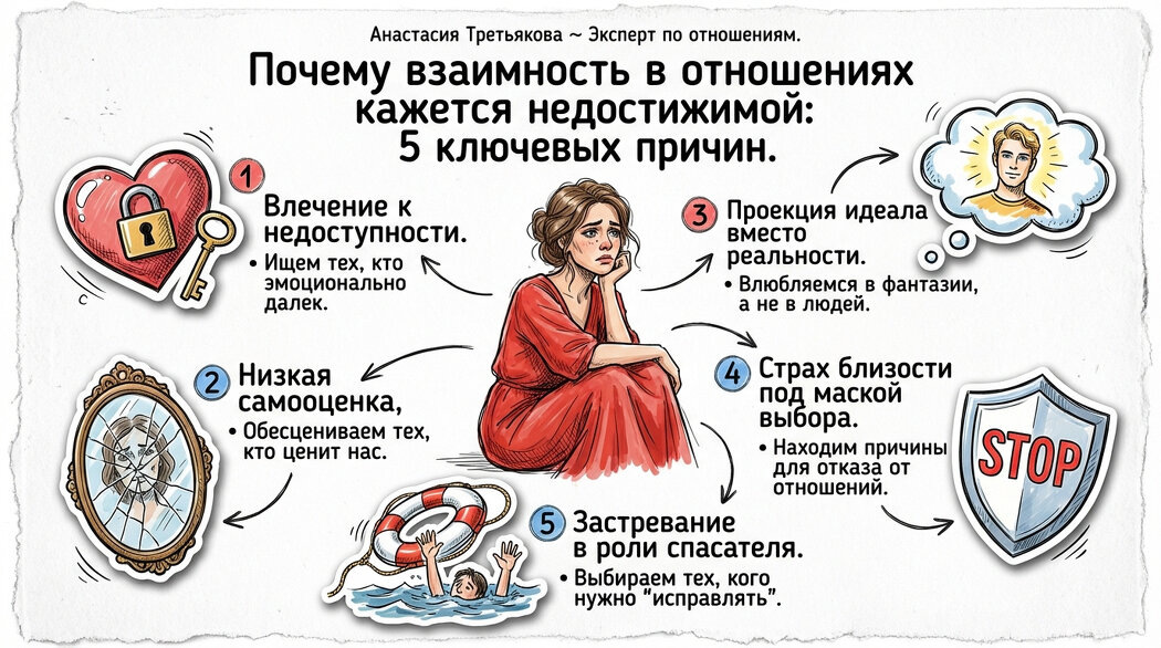 Часто на консультациях слышу «Кому нравлюсь я, не нравятся мне, а те, кто мне нравятся, я им не нравлюсь». Клиентки описывают чувство замкнутого круга, где каждое знакомство заканчивается разочарованием, внутреннюю растерянность. И ощущение, что с ними что-то не так. В этой статье я рассмотрю 5 глубинных причин этого парадокса. И покажу, как они проявляются в реальной жизни моих клиентов (детали изменены для соблюдения конфиденциальности). Познакомилась с мужчиной — интеллигентный, внимательный, пишет каждый день. Но когда встречаемся, чувствую скуку. Зато тот парень из спортзал — с ним я оживаю, сердце бьется чаще, хочется нравиться. Но он смотрит сквозь меня, будто я прозрачная. И так всегда: либо мне скучно с тем, кто рядом, либо я бегу за тем, кто не видит меня. Устала от этих качелей. Причина 1. Притяжение к недоступности Ольга пришла ко мне после пяти лет отношений с женатым мужчиной. Когда я спросила, чем он так ее притягивал. Она призналась: «С ним я чувствовала себя живой. Каж