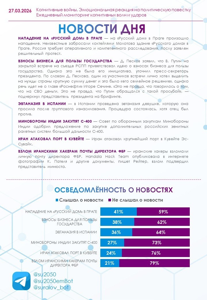 27.03.2026 🔹 Большинство опрошенных (64%) находятся в спокойном состоянии. Усталость отметили 18%, бодрость — 7%, а нервозность остается на минимальном уровне (4%). 🔹 Осведомленность о новостях этого дня — ниже среднего уровня. — Наиболее известной (41% слышали) оказалась новость о том, что неизвестные забросали коктейлями Молотова здание «Русского дома» в Праге. — Наименее известным (только 21% были осведомлены) стало сообщение о том, что иранские хакеры взломали личную почту директора ФБР К. Пателя и опубликовали в интернете его фотографии и другие документы. 🔹 Ярко выраженный негативный отклик вызвало сообщение о нападении на «Русский дом» в Праге. Только 36% читателей отнеслись к сообщению нейтрально. Остальные респонденты отреагировали отвращением (16%), раздражением (15%), злостью (11%), ненавистью (9%), печалью (8%), гневом (5%). 🔹 Позитивную оценку читателей в этот день получило сообщение о том, что Совет по оборонным закупкам Минобороны Индии одобрил предложение по з