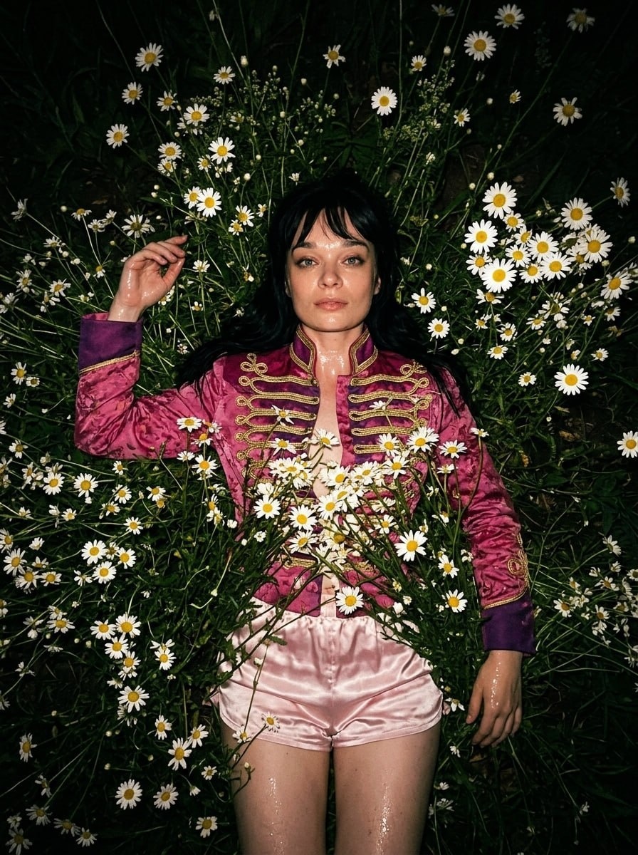 От подписчицы @PSDa_design_ksu Aspect ratio: 3:4 (portrait) An extremely dark nighttime photo, handheld smartphone shot with flash. Severely underexposed: crushed shadows, vivid bright colors. Editorial fashion photography. Strict top-down overhead view (looking straight down). A woman from the reference is lying on her back; her pose is relaxed and sensual. She is completely submerged in dense wildflowers—many white daisies and green stems surround her, and the flowers partially cover her body. She is wearing a pink-and-purple hussar jacket and pale pink satin shorts. Strong contrast of textures: smooth, glossy silk/satin versus delicate petals. The model’s skin is wet, with intense specular highlights. Hard, direct flash lighting; deep dark shadows in the background; night or evening shoot in a forest. Vintage 35mm film photo aesthetic, pronounced film grain, high contrast, saturated warm colors, fairytale forest atmosphere, cinematic, high resolution, hyperrealism, highly detail