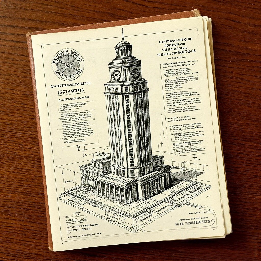Он открыл очередную папку «Строительство объектов специального назначения, 1962–1964». Внутри лежали чертежи: здания, коммуникации, схемы. На одном из листов план башни. Высокая, с часами на вершине, сложная система подземных уровней. В углу штамп: «Проект „Часовой пик“, гриф „Совершенно секретно“».