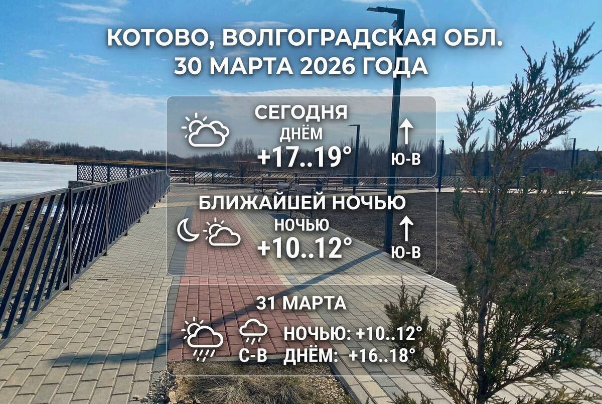 ☀️ Сегодня днем ожидается переменная облачность, +17..19°, ветер юго-восточный, умеренный. Атмосферное давление в пределах нормы. Геомагнитное поле спокойное. Ближайшей ночью переменная облачность, температура +10..12°. Атмосферное давление в пределах нормы. 31 марта, в течение суток ожидается переменная облачность, небольшой дождь; ночью +10..12°, днем +16..18°, ветер северо-восточный, умеренный.