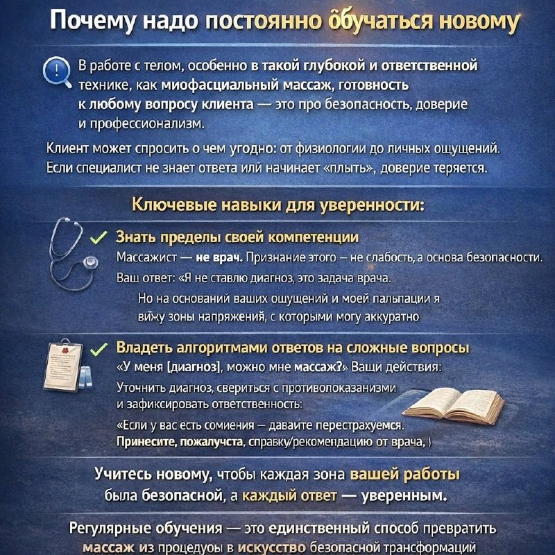 Почему надо постоянно обучаться новому. В работе с телом, особенно в такой глубокой и ответственной технике, как миофасциальный массаж, готовность к любому вопросу клиента — это не просто про «знание ответа», это про безопасность, доверие и профессионализм. ❔ Клиент может спросить о чем угодно: от физиологии до личных ощущений. Если специалист не знает ответа или начинает «плыть», доверие теряется. Ключевые навыки для уверенности: ✔️Знать пределы своей компетенции Массажист — не врач. Признание этого — не слабость, а основа безопасности. Ваш ответ⤵️ «Я не ставлю диагноз, это задача врача. Но на основании ваших ощущений и моей пальпации я вижу зоны напряжения, с которыми могу аккуратно работать» ✔️Владеть алгоритмами ответов на сложные вопросы «У меня [диагноз], можно мне массаж?» Ваши действия⤵️ Уточнить диагноз, свериться с противопоказаниями и зфиксировать ответственность: «Если у вас есть сомнения — давайте перестрахуемся. Принесите, пожалуйста, справку/рекомендацию от врача,
