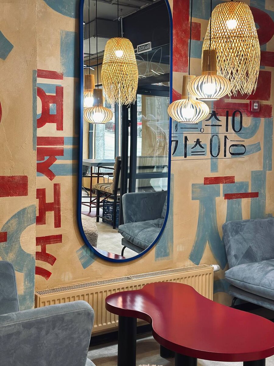 Новое место с корейской кухней в #ekb — «Тоби», в ЖК Forum City Интерьер наполнен корейскими иероглифами хангыль. Их можно найти в бордовых и серо-голубых тонах на стенах, а под потолком – «волны» освещения. Здесь также много естественного света, окна бистро выходят на ул. Радищева и ее живые потоки горожан и трамваев. Меню — типичное корейское и понятное. Рядом с раменом (630-860₽) и корн-догом (330-350₽) можно встретить лапшу с креветками или говядиной, а также пибимпап (570-650₽) и онигири (220₽). Баблти на месте, вместе с айс латте (250₽) и орео шейком (490₽). Цены не низкие, но и не люкс. Предполагаю, что здесь будет больше аудитории 25+.