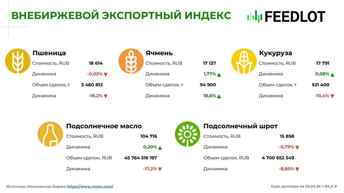 📊 Индексы на зерновые культуры (пшеницу, ячмень, кукурузу), подсолнечное масло и шрот за период с 23.03.26 по 27.03.26.