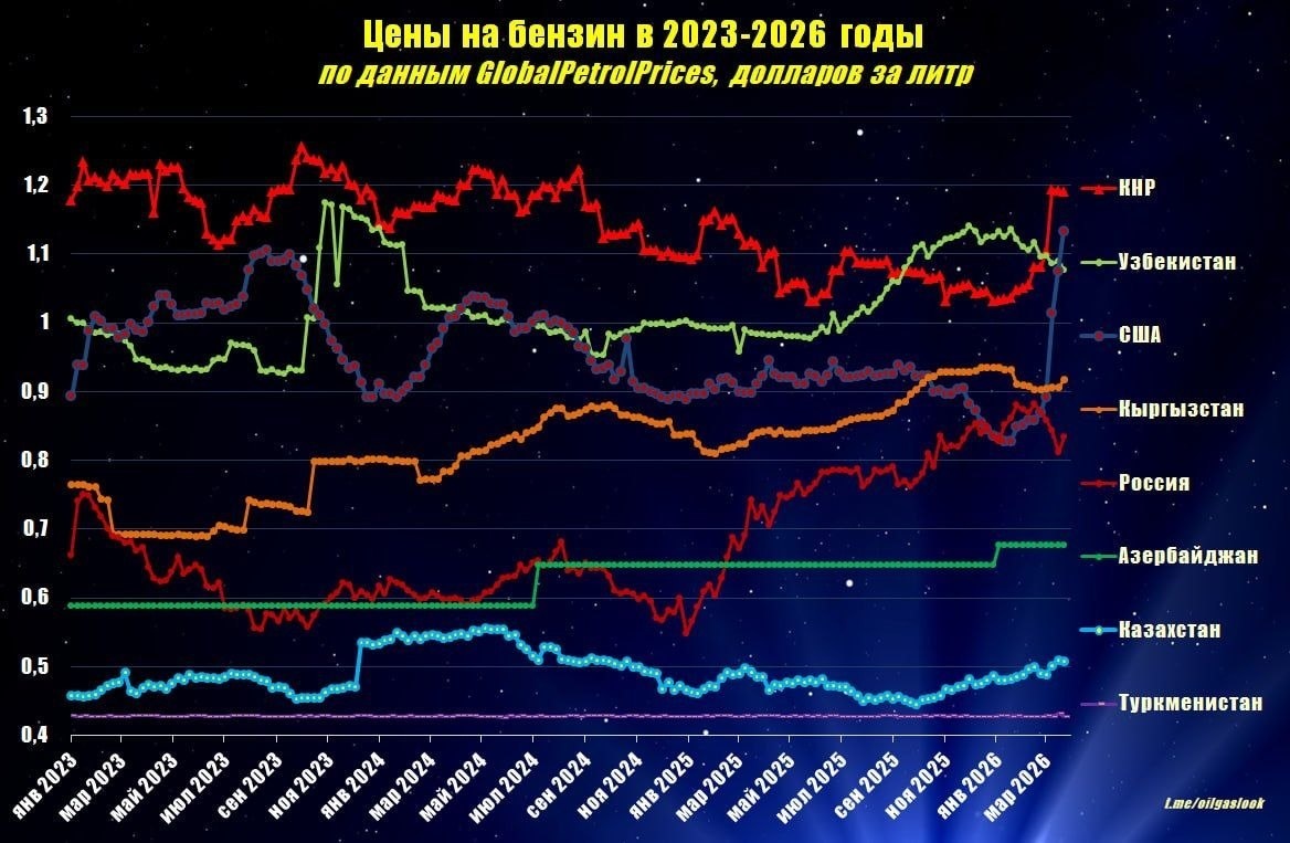 Динамика 2023-2026 гг. и текущие цены на бензин АИ-95 по данным GlobalPetrolPrices, долларов/литр: