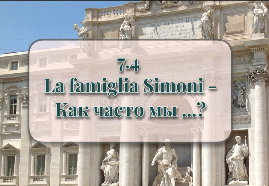Добрый день, cari amici! С удовольствием приветствую вас в нашем учебном проекте "Italiano in 30 giorni - вы это серьезно?". Сегодня у нас 4-й урок в новом, 7-ом, разделе "La famiglia Simoni". Полная подборка материалов ко всему блоку №7 "La famiglia Simoni", а также предыдущий и следующий уроки, можно посмотреть по предложенным ссылкам. подборка №7 "La famiglia Simoni" - 7.3 La famiglia Simoni - задаем правильные вопросы - следующий урок 7.5 (пока в стадии разработки) Сегодня мы научимся оперировать словами, которые помогут нам сделать нашу речь более живой и естественной. Все они отвечают на вопрос - КАК ЧАСТО? Посмотрим короткое видео и закрепим все это в упражнениях. Для закрепления полистаем карточки и хорошенько запомним перевод. Теперь сделаем перевод наоборот. Рассмотрим еще раз примеры предложений из видео. Я думаю, что теперь вы без труда сможете их понять. Если еще не очень хорошо запомнили эти слова, выполните несколько простых упражнений. Задание 1 Простое задание - найди
