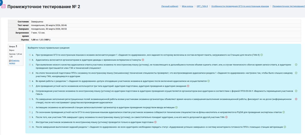 Вопрос 1 a. При проведении ОГЭ по иностранным языкам в экзамен включается раздел 1 «Задания по аудированию», все задания по которому включены в состав интернет-пакета, загружаемого на Станцию для печати (ГИА-9) b. Аудиозапись включается организаторами в аудитории дважды с временным интервалом в 3 минуты c. При выявлении низкого качества аудиозаписи ответа участника экзамена по иностранному языку (устному), не позволяющего в дальнейшем в полном объеме оценить ответ, или, в случае технического сбоя во время записи ответа, в аудиторию проведения приглашается член ГЭК и технический специалист d. На этапе технической подготовки ППЭ к экзамену по иностранному языку (письменному) технические специалисты проверяют, что воспроизведение аудиозаписи раздела 1 «Задания по аудированию» настроено так, чтобы было слышно каждому участнику ГИА, находящемуся в аудитории e. Во время работы с разделом 1 «Задания по аудированию» допуск опоздавших участников экзамена в аудиторию после включения аудиозаписи