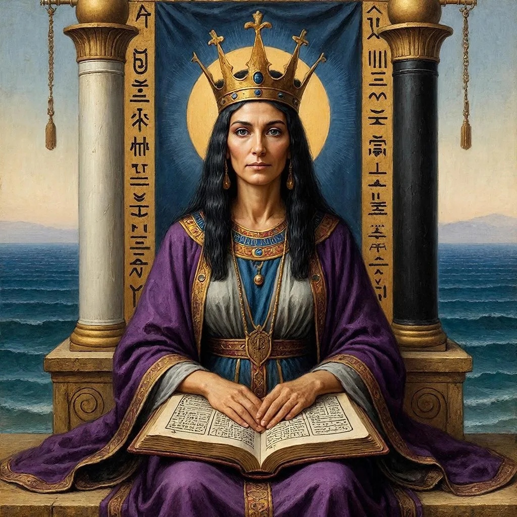 Представьте её: она сидит между двух колонн — Света и Тьмы, в руках у неё свиток с сокровенным знанием, а на груди — крест, символ баланса. Она хранит врата в тайное, куда не ступает нога обычного человека.