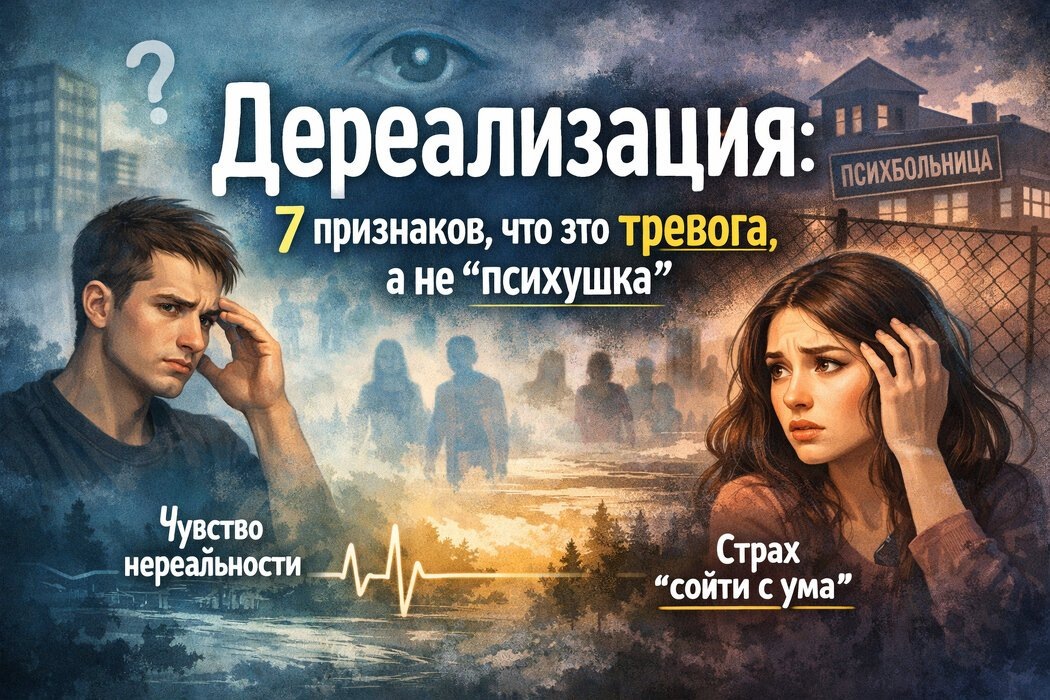 При панике и сильной тревоге дереализация может быть частью общего тревожного всплеска. Чем больше вторичного испуга вокруг симптома, тем сильнее он закрепляется.