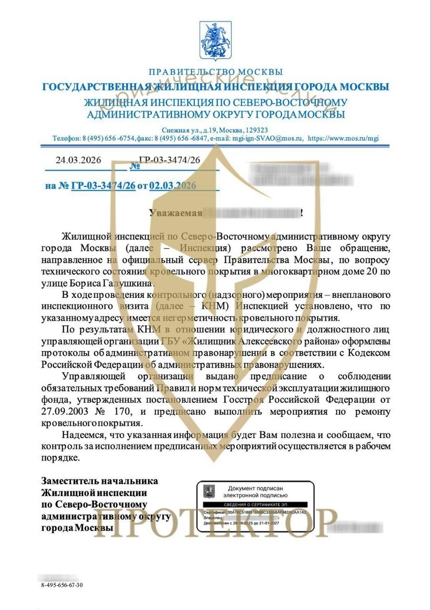 " Результат нашей работы: кровля будет отремонтирована по предписанию инспекции 📁 С чем обратились: В юридическую компанию «Протектор» обратился собственник с острой проблемой — негерметичность кровельного покрытия. Попытки решить вопрос с управляющей организацией самостоятельно не увенчались успехом. 🛡️ Что сделали: Мы не стали дожидаться сезона дождей и взяли ситуацию под полный юридический контроль: 1️⃣ Подготовили мотивированное обращение в Жилищную инспекцию СВАО. 2️⃣ Добились проведения внепланового инспекционного визита. 3️⃣ Обеспечили привлечение УК к административной ответственности за ненадлежащее содержание общего имущества. 🤝 Результат: ✅ Управляющей организации выдано обязательное для исполнения предписание о выполнении ремонтных работ. ✅ Исполнение предписания находится на контроле инспекции, что гарантирует устранение нарушений в установленный срок. Своевременное обращение к юристам позволило клиенту не только зафиксировать нарушения, но и запустить механизм пр